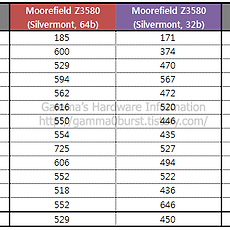 반응형 스마트폰/인텔 Intel Atom16 64bit 적용 인텔 무어필드 긱벤치3 성능 향상. (ATOM, Moorefield, Geekbench3, 64bit) - 64비트가 적용된 인텔 무어필드 긱벤치3 결과입니다. 초기 벤치같으 느낌이기때문에 참고 수준입니다. - 링크 64bit http://browser.primatelabs.com/geekbench3/1794238 http://browser.primatelabs.com/geekbench3/1794301 http://browser.primatelabs.com/geekbench3/1794256 32bit http://browser.primatelabs.com/geekbench3/2039808 http://browser.primatelabs.com/geekbench3/1938787 http://browser.primatelabs.com/geekbench3/1700966 http://browser.primatel.. 2015. 3. 28. 인텔 체리트레일(Cherry Trail) CPU 성능 분석. (GeekBench3) - 인텔 체리트레일 긱벤치3 결과 분석입니다. 체리트레일은 아톰 X5/7 라인업으로 재편되었지만 여기서는 체리트레일로 얘기하겠습니다. CPU는 실버몬트(Silvermont)의 14nm 버전인 에어몬트(Airmont)로 알려져있습니다. 이러면 보나마나 실버몬트와 성능이 똑같다고 누구나 예상할 수 있지만...... 당연하다고 생각하는걸 확실한 것으로 하는 것도 필요하겠지요. - 긱벤치 비교는 베이트레일 Z3795, 체리트레일 X7-Z8700 둘 다 베이스클럭 1.6GHz, 부스트 클럭 2.4GHz 입니다. 긱벤치3에서 동작클럭은 부스트 클럭이라고 보면 됩니다. (링크 : 긱벤치3에서의 베이트레일 동작 특성 분석.) - 링크 1. Z3796 64bit http://browser.primatelabs.com/g.. 2015. 3. 17. 인텔 체리트레일(Cherry Trail/View) GPU 사양/성능 추정. (update 2015.03.13) - 체리트레일 사양 분석/추정이라고 했지만 사실 인텔 내장 그래픽 유닛 전반에 대한 학습을 정리한겁니다. 틀린 부분이 있을 수도 있으니 참고바랍니다. (뭐 깊게 들어갔다고 학습인지 모르겠지만요.) - 체리트레일 사양 성능에 관한 인텔 공개 자료는 많은데 최근 것만 올리겠습니다. 최근 인텔이 아톰 라인업을 X3/X5/X7 로 정리하면서 표면적으로는 체리트레일이라는 코드네임이 안 보입니다. 코드네임으로는 그대로 남아있을듯 하지만요. 체리트레일은 X5/X7 라인업에 해당하고 X3 라인업은 CPU만 아톰코어이고 통신 모뎀, GPU 등은 외부 IP를 활용합니다. 14nm 공정 CPU : Airmont 기반 최대 쿼드코어 2.4GHz - 사실상 실버몬트와 같은 코어로 공정만 14nm로 변경됐다고 보면 됩니다. GP.. 2015. 3. 8. 긱벤치3에서의 베이트레일 동작 특성 분석. 제목이 분석이라니까 뭔가 거창하지요. 그냥 숫자 끼워맞춰 보는겁니다. - 과거 베이트레일 성능을 분석한 포스팅에서 동클럭 성능 비교가 빠지지 않았는데 이 때 기준 클럭을 어떻게 잡을 것인가를 놓고 논쟁이 있었습니다. (링크 : 긱벤치3를 통한 베이트레일 성능 비교. (update 2014.01.27)) (링크 : ARM vs X86(X64) 성능 비교.(Ubuntu) v14.02) 싱글코어 테스트 클럭은 터보부스트 클럭이고, 멀티코어 테스트 클럭은 베이스 클럭이지 않느냐는 것. 베이트레일(실버몬트 코어)의 긱벤치3 테스트 결과를 통해 이를 확인해보겠습니다. - 테스트 결과 링크 Celeron J1850 : http://browser.primatelabs.com/geekbench3/100704 Atom E.. 2014. 3. 2. 긱벤치3를 통한 아톰 성능 비교. (Geekbench3, Intel ATOM) 긱벤치2 결과로 역대 아톰 성능을 비교한 적이 있었는데 이번엔 긱벤치3 결과를 토대로 입니다. - 비교제품. 45nm 아키텍처는 본넬(Bonnell) 32nm 아키텍처는 솔트웰(Saltwell) 동클럭 성능 비교입니다. 2008 2Q 230 : http://browser.primatelabs.com/geekbench3/26894 N270 : http://browser.primatelabs.com/geekbench3/14236 Z540 : http://browser.primatelabs.com/geekbench3/57349 Z520 : http://browser.primatelabs.com/geekbench3/40104 2008 3Q 330 : http://browser.primatelabs.com/gee.. 2013. 9. 14. 역대 아톰 성능 비교. (Intel ATOM) (update 2013.09.14.) 이제까지 출시된 아톰들의 성능을 비교해봤습니다. - 조건. Geekbench2 2.4.0 이상 버전 결과. (버전이 올라갈수록 스코어가 낮아짐.) OS : 윈도우즈. - 비교 제품. http://ark.intel.com/ 의 아톰 프로세서 중 윈도우즈에서 테스트한 Geekbench2 결과가 있는 제품만을 선택. 출시시기는 인텔 홈페이지 참고. 45nm 아키텍처는 본넬(Bonnell) 32nm 아키텍처는 솔트웰(Saltwell) 2008 2Q 230 : http://browser.primatelabs.com/geekbench2/978515 N270 : http://browser.primatelabs.com/geekbench2/2278922 Z540 : http://browser.primatelabs.com.. 2013. 9. 8. 아톰 실버몬트(Silvermont) 성능 추정. (Update 2013.08.12) Geekbench 테스트 결과 중에 아톰 Z3770 이란게 있는데 저는 이걸 메리필드로 보고 있습니다. 베이트레일이든 메리필드든 신형 아톰이라는건 맞을 것이고, 그렇다면 CPU는 실버몬트 기반이겠지요. 이 결과를 근거로 기존의 아톰(Saltwell)과 Cortex-A15와 성능을 비교해보겠습니다. - 2013.08.05. Z3770은 베이트레일-T 라고 하네요. (http://vr-zone.com/articles/bay-trail-t-coming-september-11/49425.html) - - 2013.08.12. 새로운 테스트 결과가 나타났습니다. (http://browser.primatelabs.com/geekbench2/2226937) 이전에 비해 정수결과가 크게 상승되었습니다. 이를 토대로 결.. 2013. 8. 12. 인텔 베이트레일(Bay Trail) 그래픽 성능 추정과 실제. (update 14.03.01) 인텔의 차기 아톰 라인업 제품인 베이트레일의 정보를 종합해서 현재까지 드러난 베이트레일의 그래픽 사양과 성능을 추정해보겠습니다. 현재 나온 정보로는 크게 4가지입니다. Bay Trail-T, M, D, Merrifield 베이트레일 D/M는 리테일 보드나 넷탑, 넷북 정도로 나올 것이고, 베이트레일-T는 윈도우 태블릿으로 나올듯 합니다. 안드로이드 태블릿/스마트