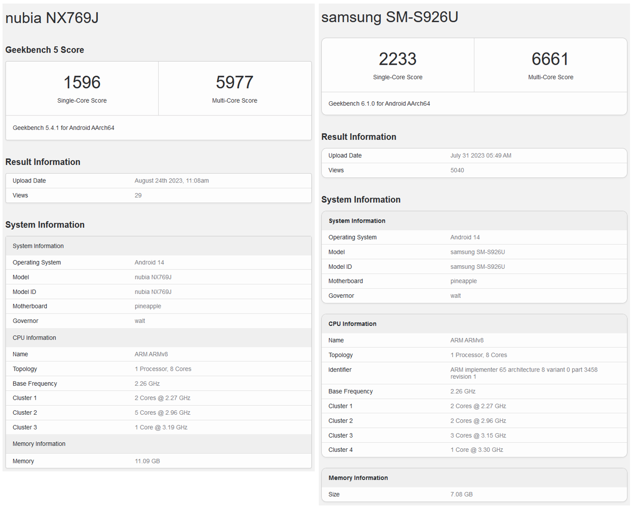 - SM8650(스냅8 gen3) 탑재 누비아(nubia) 제품 긱벤치5 결과.