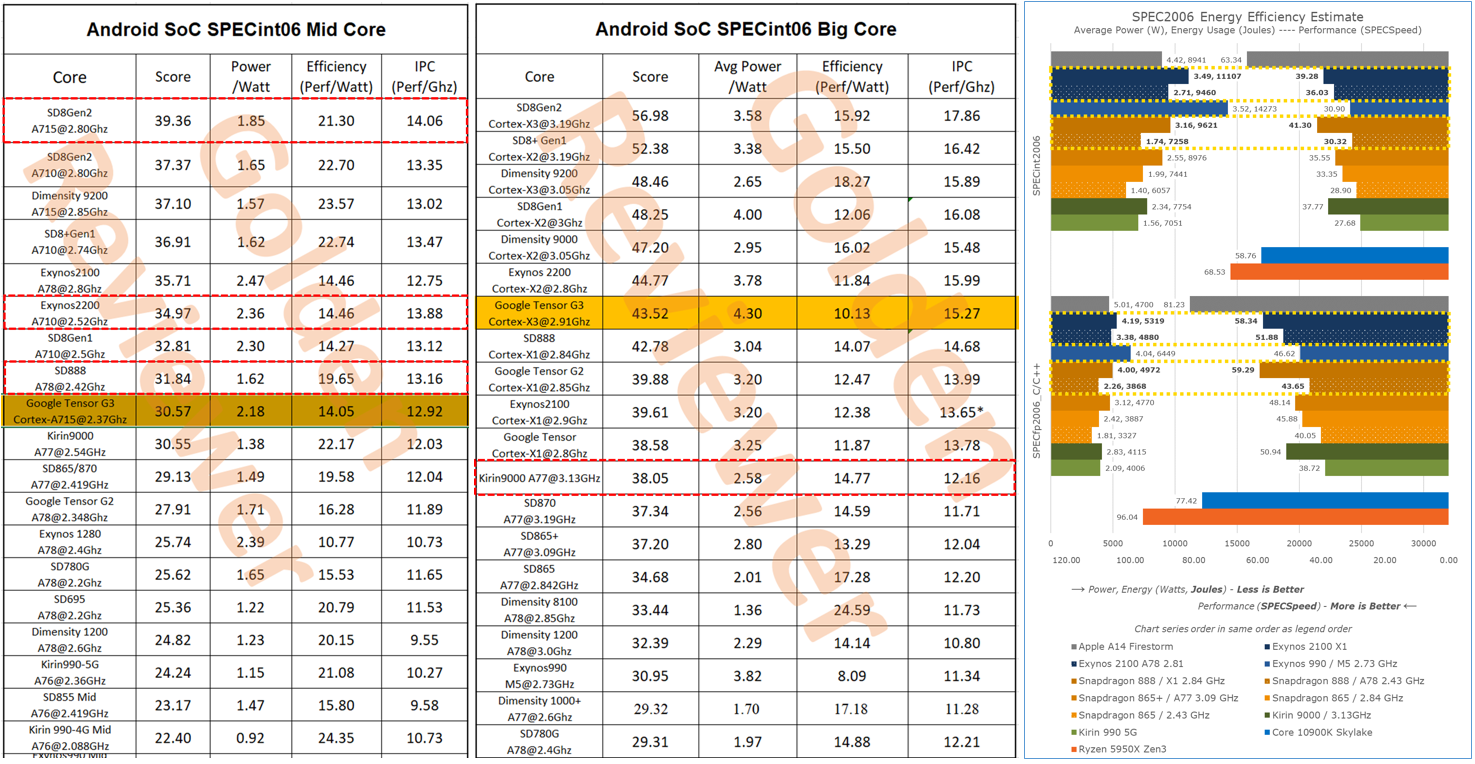 ARM 자료에 따르면 고클럭 구간에 가지 않는 한 미들코어 아키텍처 간의 성능, 전력 차이는 미미한데, 긱벤치, SpecINT 결과로 실제 그러함이 확인이 됐음.