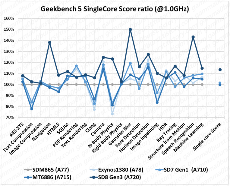 (긱벤치5 기준 IPC라면 CA77을 쓰는게 맞겠으나, 세부 성능 특성에서 CA78~CA715가 차이를 보인 점을 생각하면 긱벤치로 드러나지 않는 차이가 있을 것으로 추측됨.)