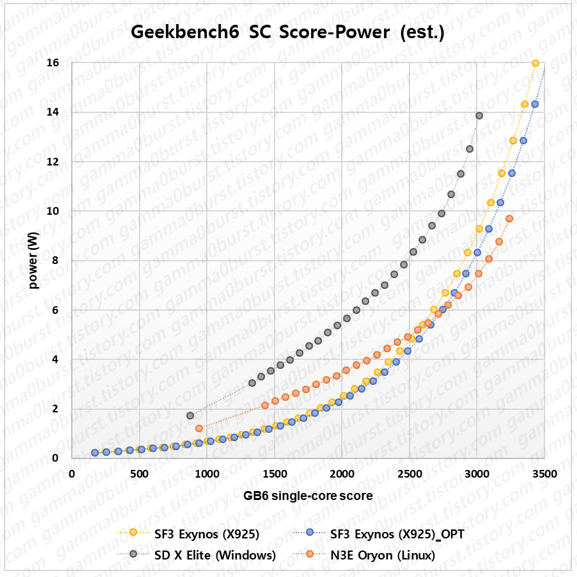 리눅스에서 N3E 공정 Oryon 코어의 점수-전력 커브를 추정.