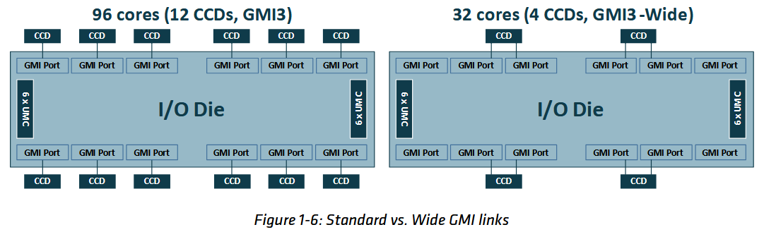 CCD에는 GMI3 인터페이스가 2개있지만 IOD의 GMI3 개수때문에 CCD 12개, 8개인 제품은 CCD-IOD간 커넥션이 1개 (GMI3-Narrow) 이고, CCD 4개인 제품은 커넥션이 2개(GMI3-Wide)임.