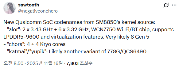 | 퀄컴 스냅드래곤 유출 정보 정리. (2025.11.20.) (0) | 2025.11.21 |