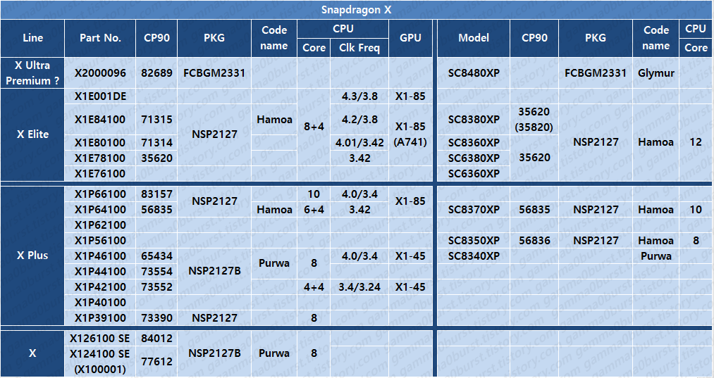 다른 다이인 Hamoa, Purwa도 최종 패키지는 같은 것처럼 SC8480XP는 모델명 패턴상 Elite 라인이고 X2000096은 상위 라인으로 다른 모델명을 가질 수 있기때문.